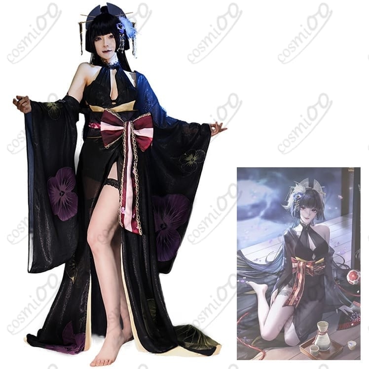 この「長夜に花」Ver.では、彼女の儚さと美しさを表現するために、深紫×黒×金のコントラストが際立つデザインとなっています。夜風に舞うような浴衣風シルエットが印象的で、撮影時には照明の反射で美しい光沢を放ちます。