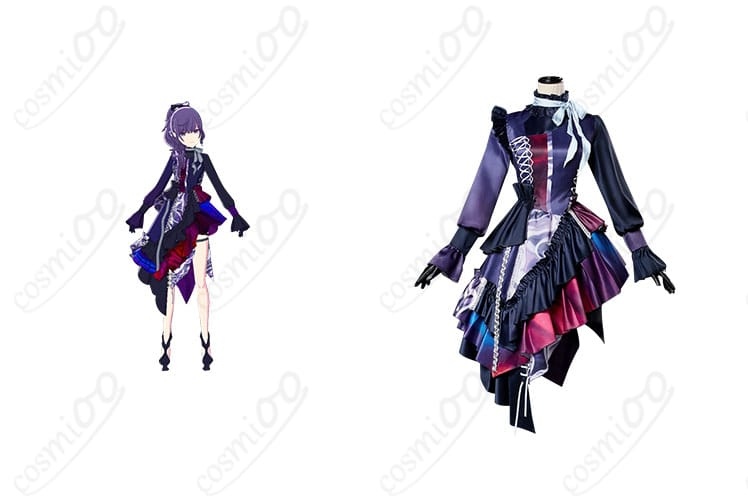 この衣装は、彼女の内面にある複雑な感情を表現するように、ダークな清楚さを大切にしています。ポリエステル、綿、合成皮革、サテンなどを使用し、上質な仕上がりです。さらに、髪飾りや耳飾り、太もも飾りなど、細部にまでこだわったアクセサリーが特徴的です。